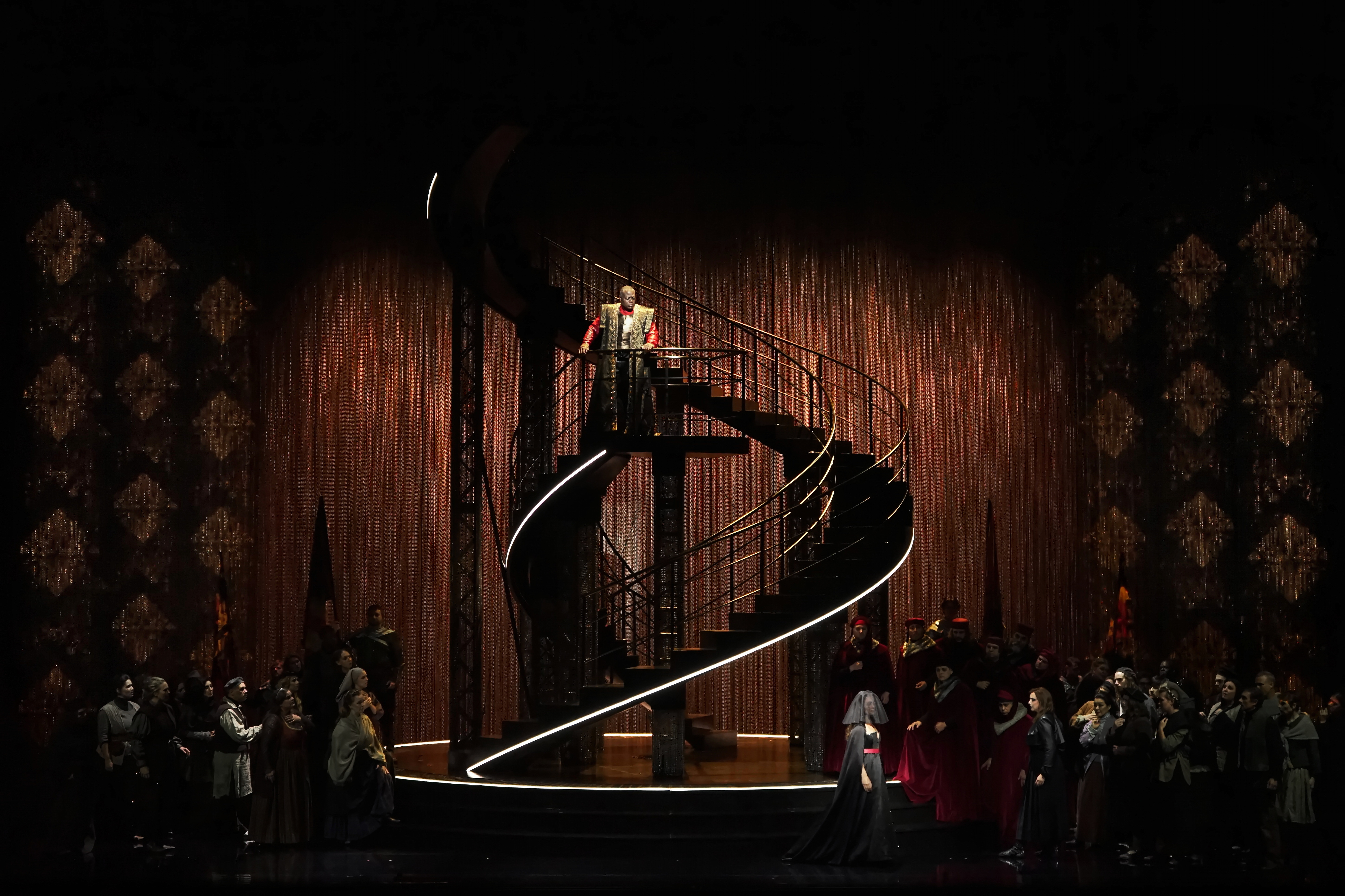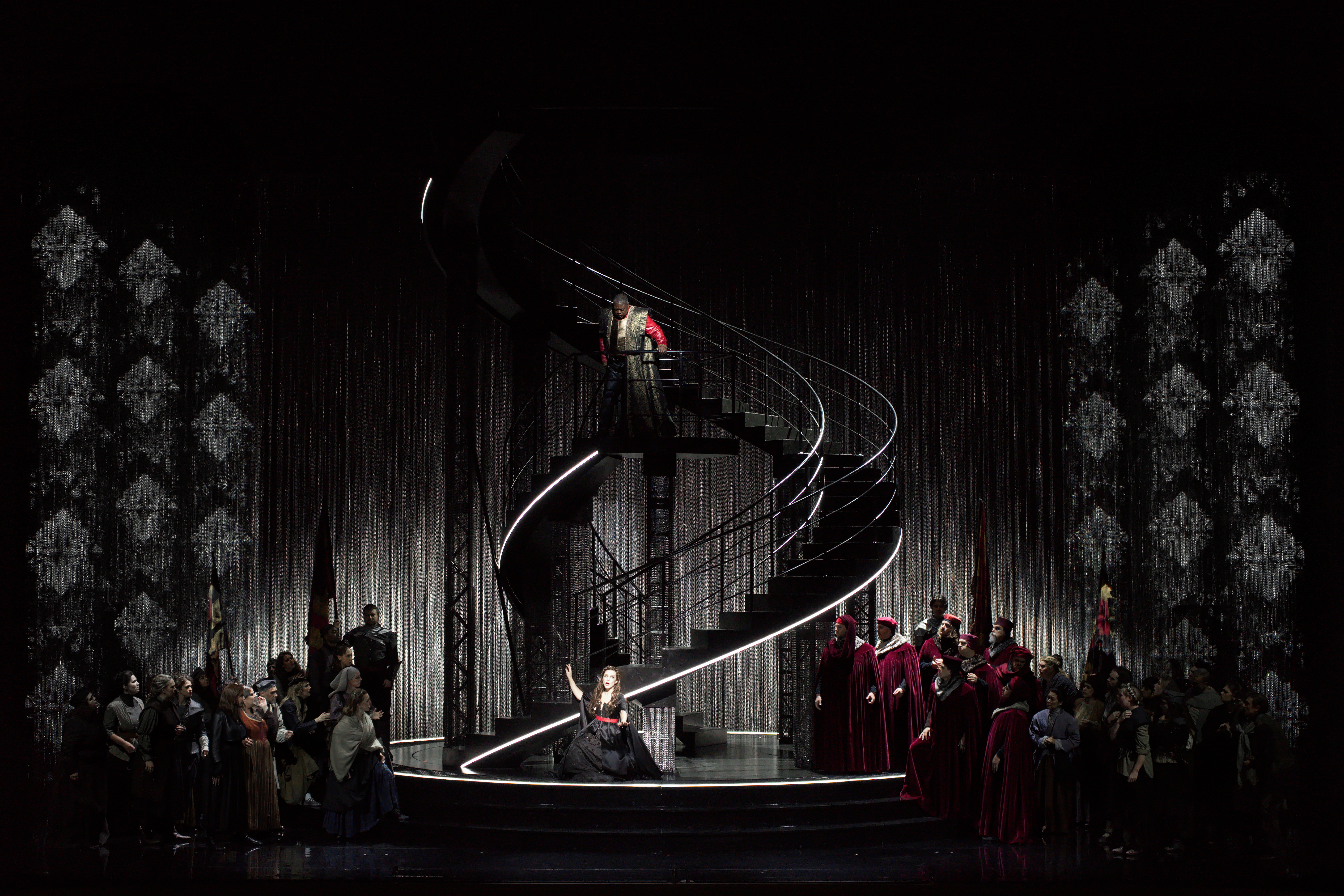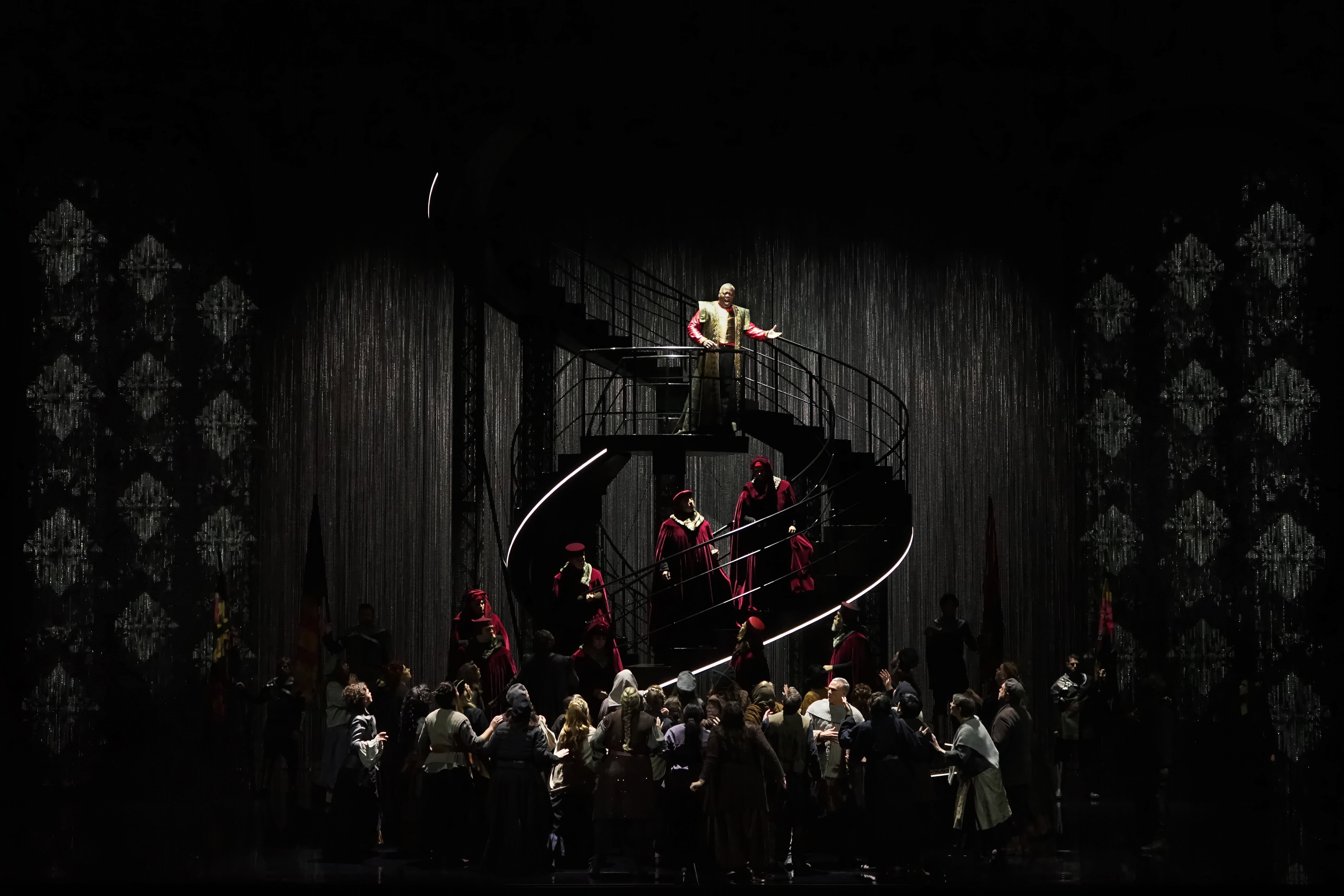 À l’occasion de la première production américaine intégralement mise en scène de Dalibor de Bedřich Smetana, le Fisher Center at Bard devient le lieu d’une renaissance lyrique rare, sous la direction de Jean-Romain Vesperini et la baguette magistrale de Leon Botstein. Le drame chevaleresque, tissé de vengeance, d’amour et de destin, y est redonné à travers le prisme d’un visuel puissant : décors créés par Bruno de Lavenère, costumes signés Alain Blanchot, lumières de Christophe Chaupin, tous combinés au travail de projection vidéo d’Étienne Guiol, qui offre des images fortes, rideaux métalliques, projections de figures spectrales comme l’ombre de Zdeněk, scrims modulés, pour incarner les rêves, les fantômes et les désirs inavoués du personnage titular Dalibor.
