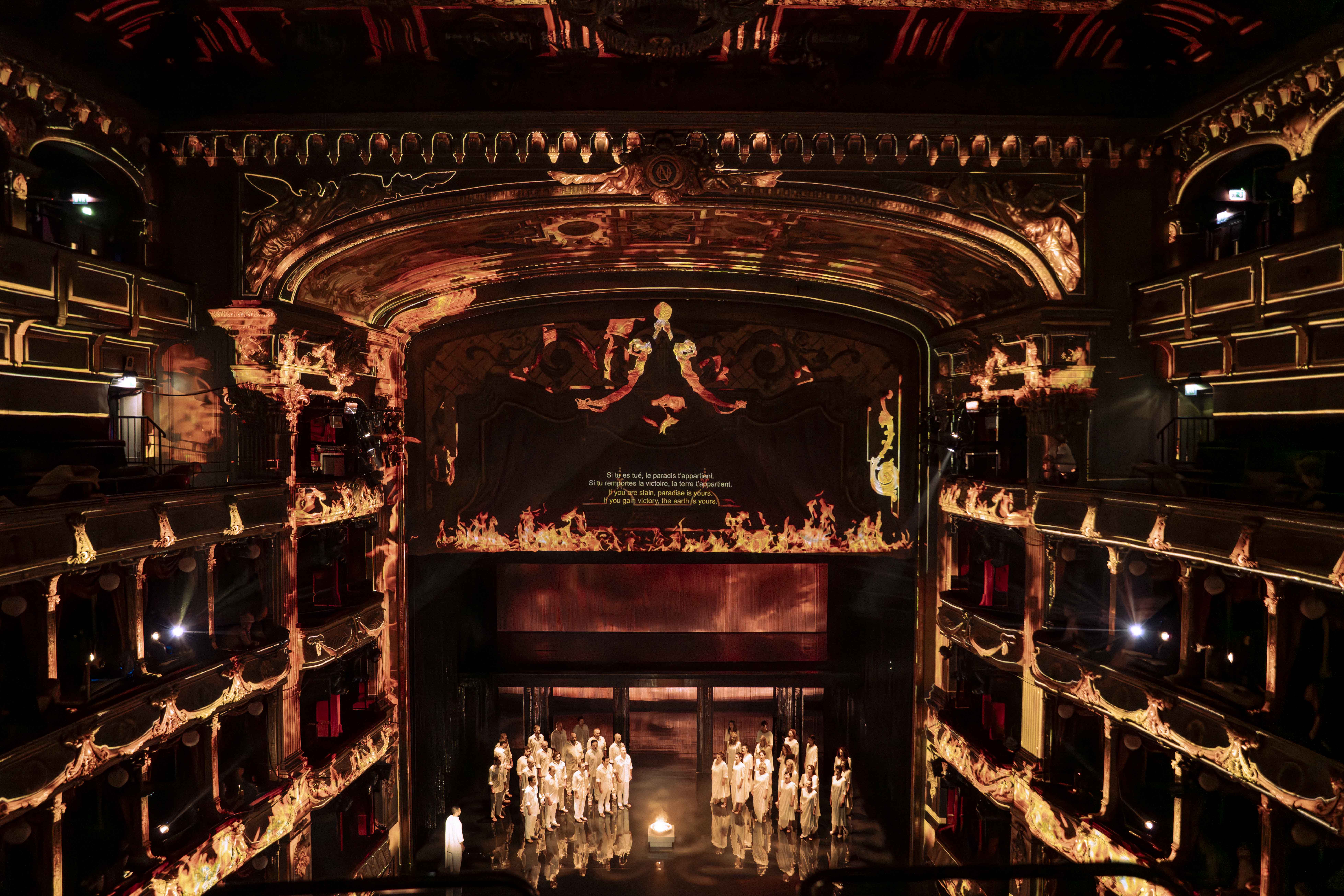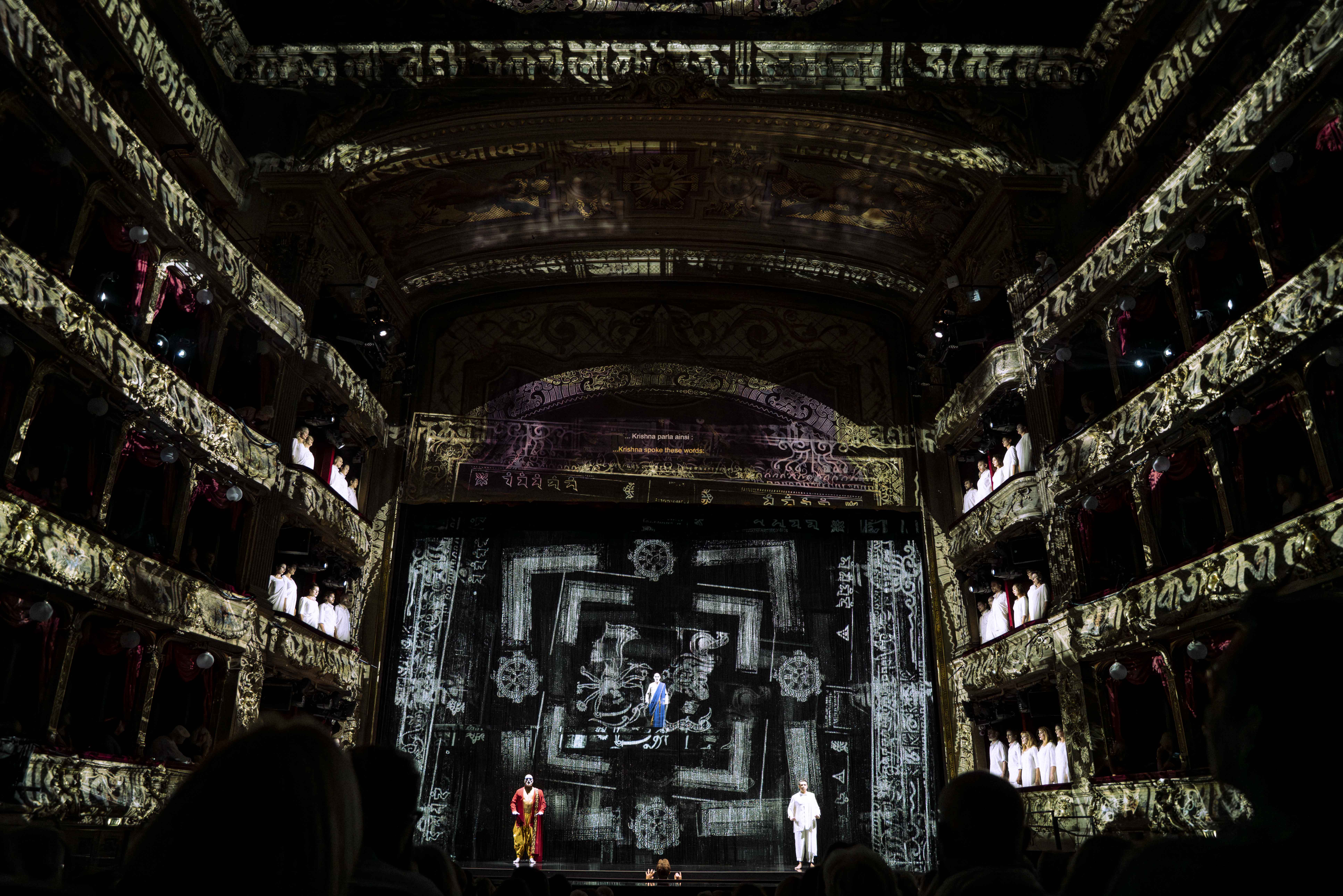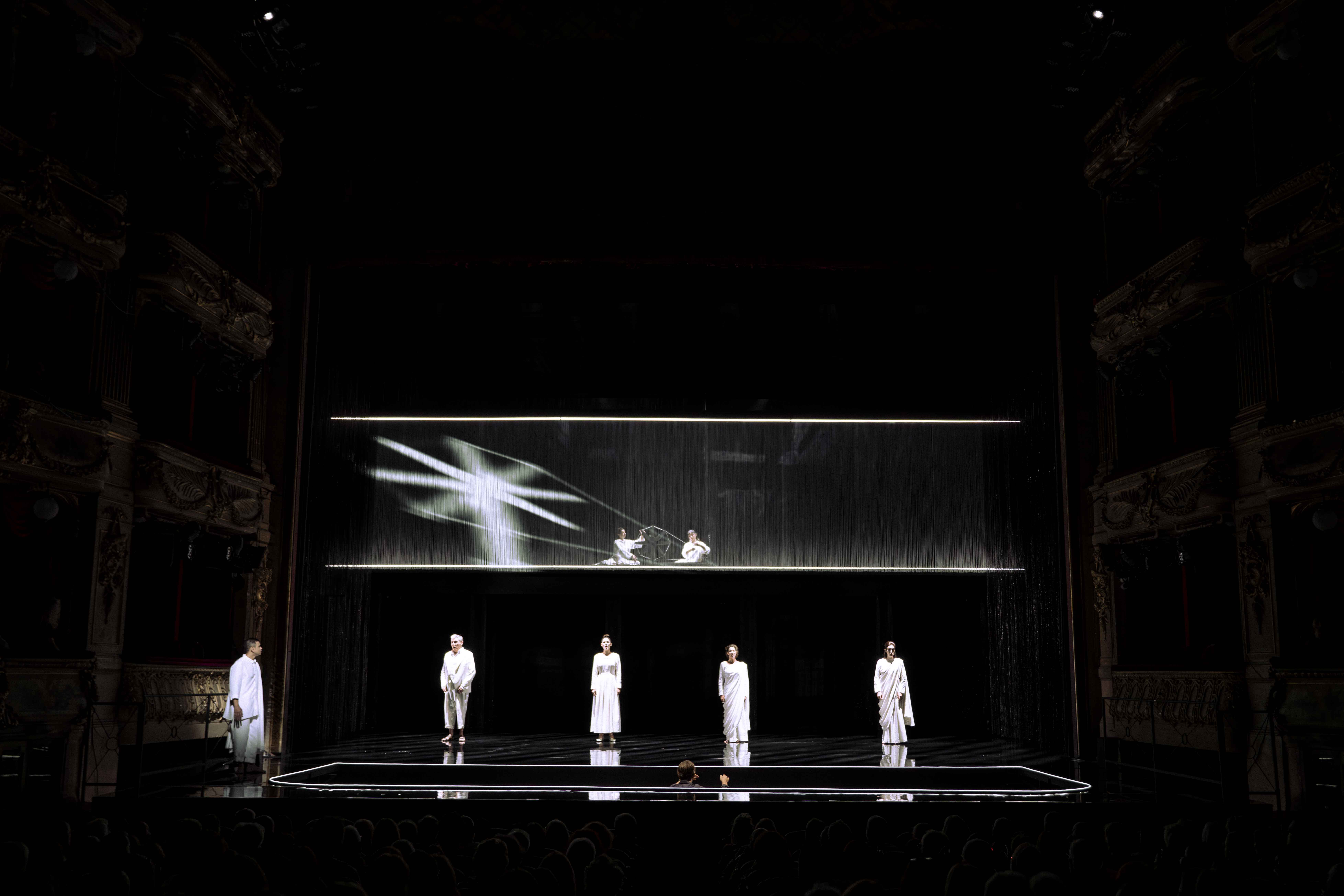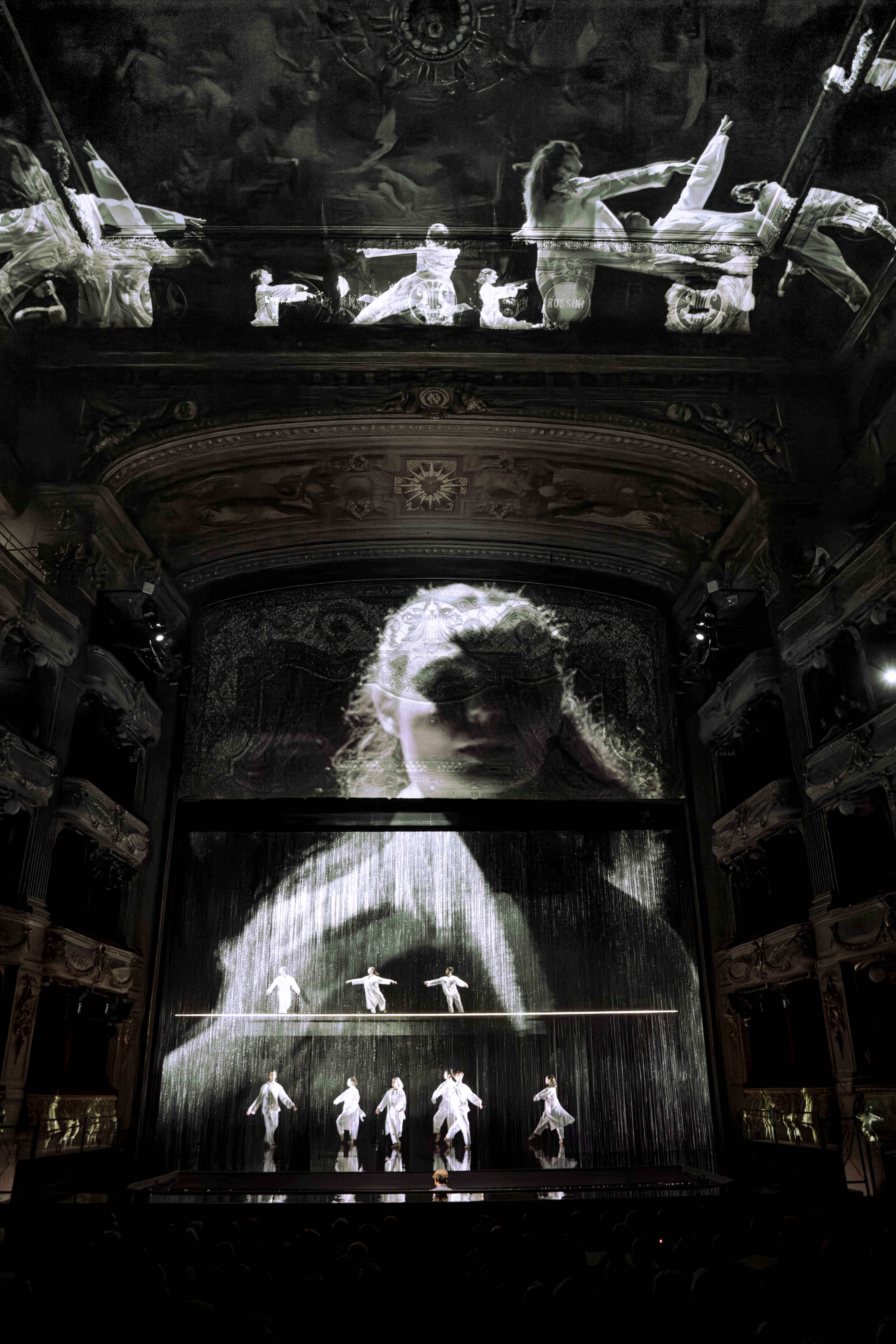 Cette conception visuelle, à la croisée de la scénographie et du mapping architectural, a permis d’intégrer le décor dans une architecture vivante. Chaque surface devient un espace narratif vibrant, traversé de flux lumineux et de symboles. En collaboration étroite avec les équipes artistiques et techniques, le Studio A+E a transformé l’Opéra de Nice en un véritable temple visuel, où la musique de Glass résonne comme une prière et l’image devient souffle, énergie et conscience.